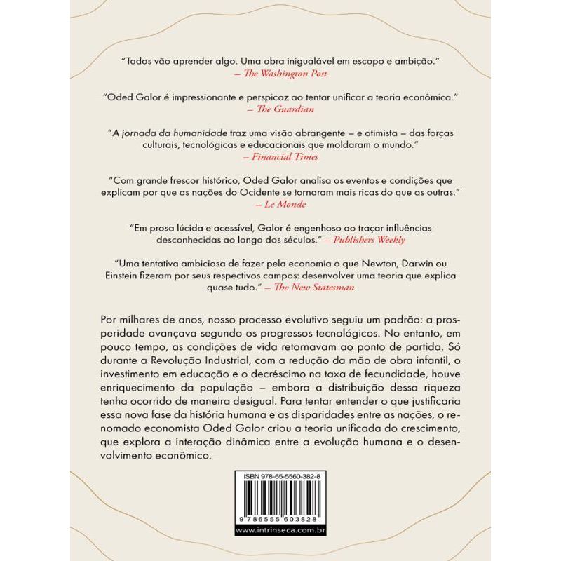 Ao pesquisar esse processo, Oded Galor, um dos pensadores mais proeminentes da atualidade, criou a teoria unificada do crescimento, que explora a interação dinâmica entre a evolução humana e o desenvolvimento econômico. Hoje, a humanidade se encontra em uma nova encruzilhada: o progresso e o meio ambiente parecem ter entrado em rota de colisão. Mas Galor está otimista. Pioneiro na análise do impacto da evolução humana e sua adaptação, o autor prevê um futuro bem mais positivo do que o geralmente esperado.