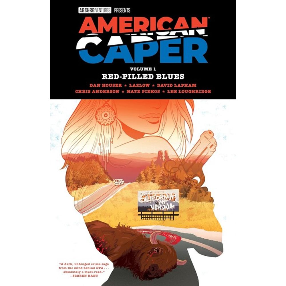 AMERICAN CAPER: RED-PILLED BLUES collects the first four issues of the new crime-fiction saga and is created and written by Rockstar Games co-founder DAN HOUSER (Grand Theft Auto, Red Dead Redemption) with additional writing by LAZLOW, art by Eisner Award-winner DAVID LAPHAM (Stray Bullets) and CHRIS ANDERSON with covers by TYLER BOSS (4 Kids Walk into a Bank).