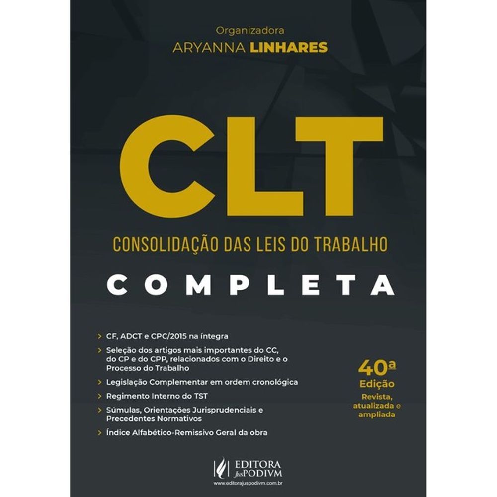 Em um trabalho cuidadoso, detalhado e muito bem organizado, Aryanna Linhares selecionou a legislação verdadeiramente útil e criou um material riquíssimo que, no momento da prova ou mesmo no dia a dia do escritório, permite ao operador localizar facilmente os temas relacionados com o direito e o processo do trabalho. A CLT tem duas características que merecem ser destacadas. A primeira é a criteriosa seleção de palavras que constam no índice remissivo, com foco na otimização da consulta. Isso possibilita que o usuário, ao pensar em determinado tema, encontre a palavra relativa a ele facilmente e, em seguida e de maneira rápida, localize o fundamento buscado. A segunda é a transcrição, logo abaixo dos artigos da CLT, do texto de outros dispositivos legais a eles relacionados, contribuindo para o aproveitamento do tempo de quem a utiliza. A coordenadora buscou excluir tudo o que pudesse atrapalhar a pesquisa e deixou na obra apenas o que é realmente necessário.