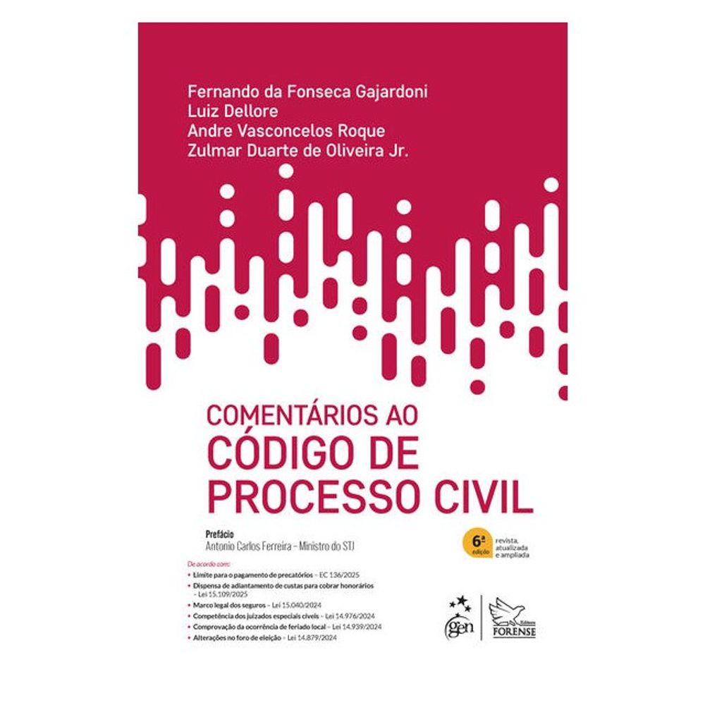Os comentários ora publicados, revistos e atualizados, tratam das Leis 15.109/2025 (dispensa o advogado do adiantamento de custas processuais em ações de cobrança e em execuções de honorários advocatícios), 15.040/2024 (marco legal dos seguros), 14.976/2024 (competência dos Juizados Especiais), 14.939/2024 (comprovação do feriado local), 14.879/2024 (alterações nas regras de foro de eleição) e 14.833/2024 (tutela específica de obrigação de entrega), além de trazer julgados relevantes dos tribunais superiores, especialmente Temas Repetitivos do STJ e decisões em Repercussão Geral do STF.