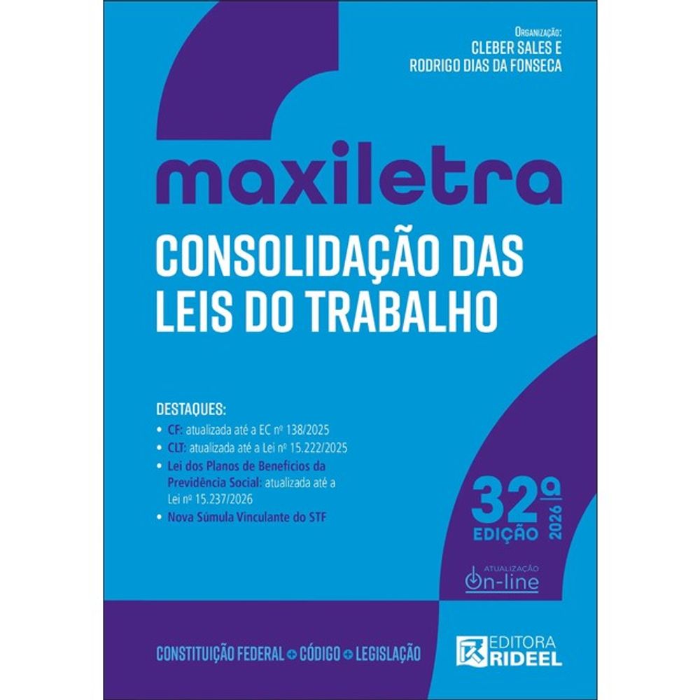 A Editora Rideel, atendendo à necessidade de estudantes e profissionais da área jurídica por obras com letras maiores, que permitam uma leitura agradável no texto legislativo plenamente atualizado, criou a Coleção de Legislação Maxiletra 2026.