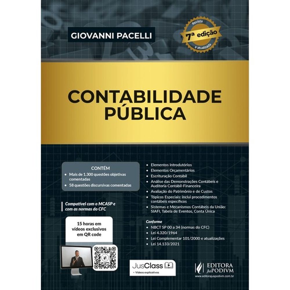 Fazem parte integral desta obra 25 corolários (contribuição exclusiva deste autor para a ciência contábil no setor público) e 120 videochamadas do autor disponíveis em QR Codes de forma gradual e progressiva contendo a visão do professor e autor sobre aquele tópico (normalmente os tópicos mais complexos).