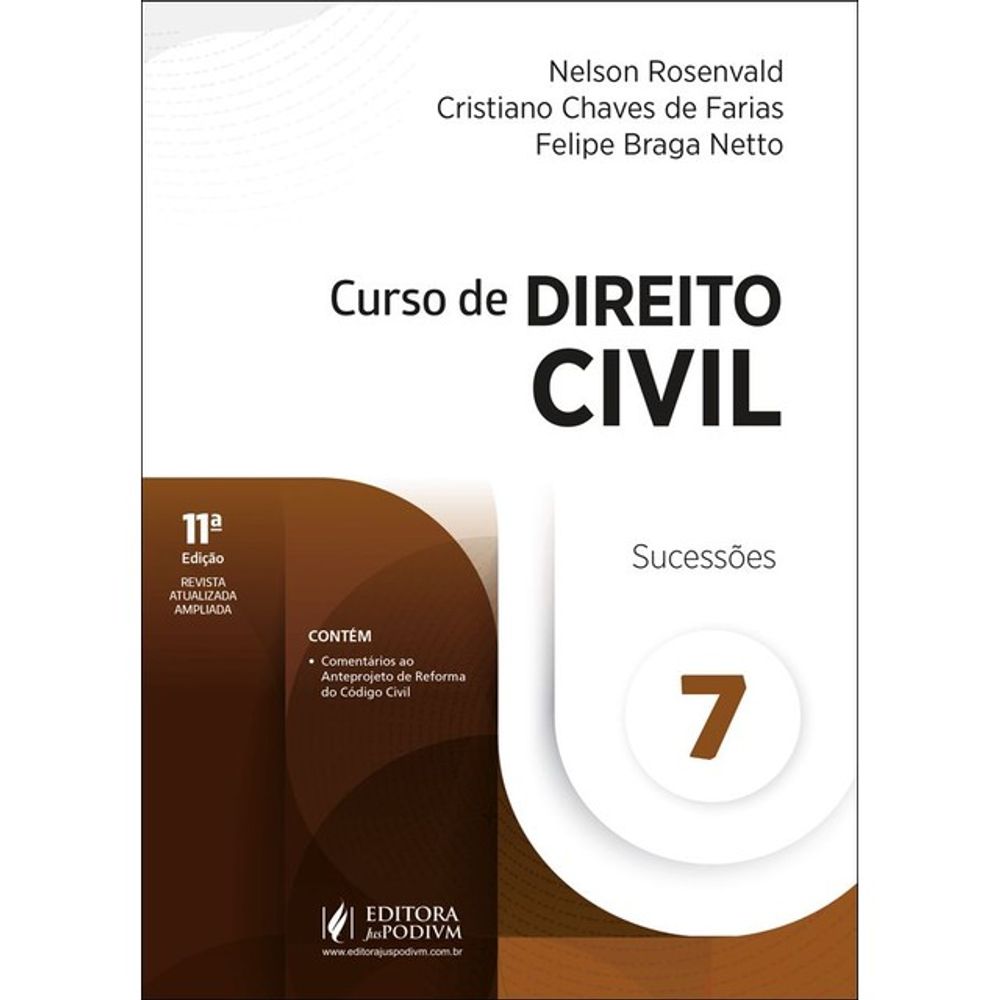 O Curso de Direito Civil escrito, cuidadosamente, a quatro mãos por Cristiano Chaves de Farias e Nelson Rosenvald, publicado pela Editora JusPodivm, é composto por 7 volumes, cobrindo de forma didática, atualizada e sistemática todos os segmentos e modelos jurídicos do direito privado brasileiro contemporâneo. Os autores se servem de sólida formação acadêmica, aliada à longa experiência no magistério – inclusive na preparação para concursos públicos – e à prática diuturna no Ministério Público para apresentar à comunidade jurídica uma substanciosa e verticalizada análise do Direito Civil da contemporaneidade.