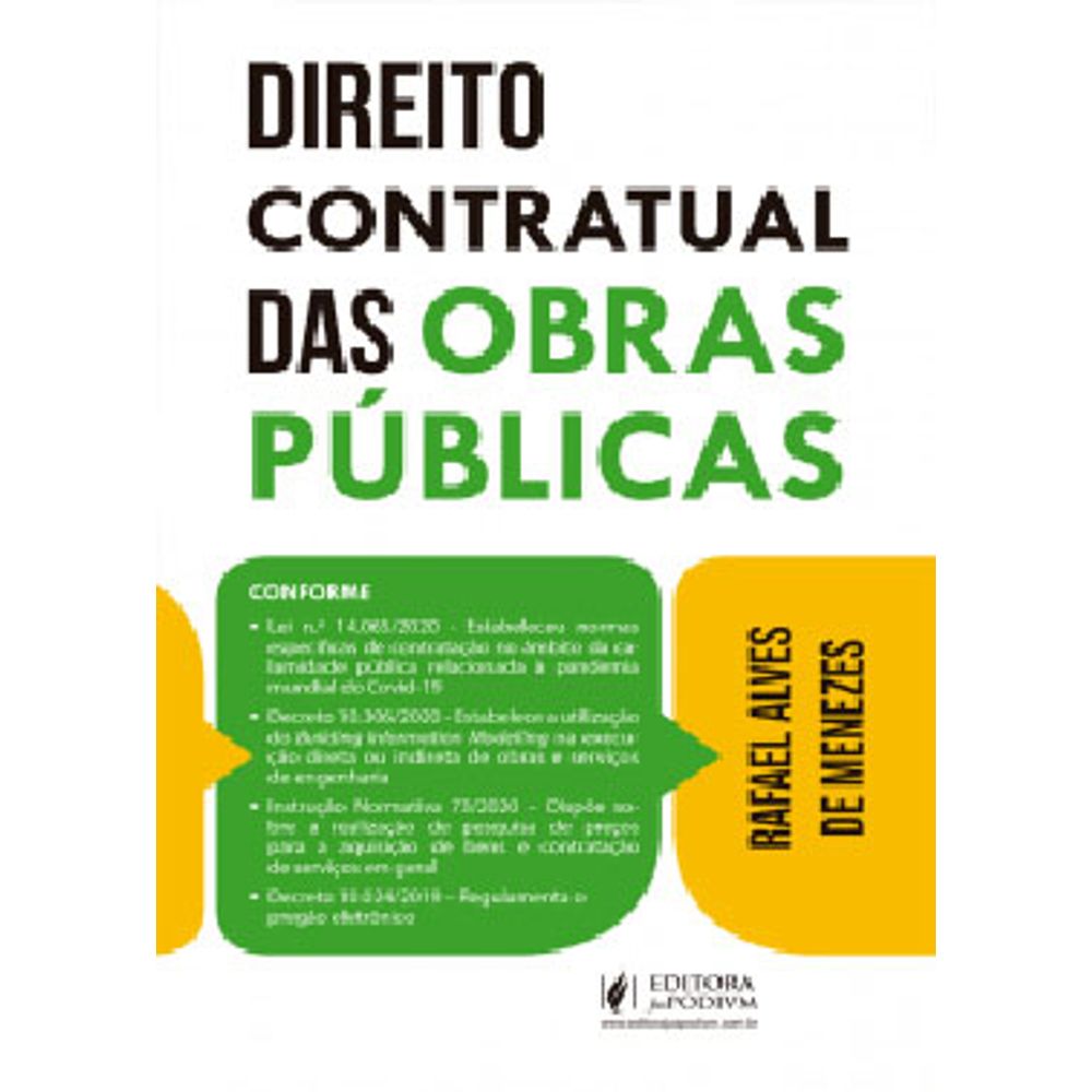 CONFORME: • Lei n.º 14.065/2020 - Estabeleceu normas específicas de contratação no âmbito da calamidade pública relacionada à pandemia mundial do Covid-19 • Decreto 10.306/2020 - Estabelece a utilização do Building Information Modelling na execução direta ou indireta de obras e serviços de engenharia • Instrução Normativa 73/2020 – Dispõe sobre a realização de pesquisa de preços para a aquisição de bens e contratação de serviços em geral • Decreto 10.024/2019 – Regulamenta o pregão eletrônico A presente obra é resultado de anos de atuação prática profissional na área jurídica, inicialmente, no âmbito do Poder Judiciário e, posteriormente, no âmbito do Poder Executivo, especialmente com exame de editais de licitação e contratos administrativos, bem como elaboração de diversos pareceres acerca de questionamentos pertinentes à gestão contratual. Além da abordagem da Lei n.º 8.666/1993, principal legislação de licitações e contratos públicos atualmente, tratei também de disposições específicas acerca das obras públicas nos diplomas legislativos da Lei n.º 10.520/2002 (Lei do Pregão), Lei n.º 12.462/2011 (Lei do RDC) e Lei n.º 13.303/2016 (Lei das Estatais). Teci comentários, ainda, acerca da Lei n.º 8.987/1995 (Lei das concessões) e Lei n.º 11.079/2004 (Lei das PPPs), especificamente nas questões das obras públicas no âmbito da concessão administrativa. Também há ponderações sobre o Decreto n.º 7.983/2013, que trata de regras e critérios para elaboração do orçamento de referência de obras e serviços de engenharia, contratados e executados com recursos dos orçamentos da União, e a respeito do Decreto n.º 10.024/2019, que deu uma nova regulamentação ao pregão, além de outros atos normativos pertinentes à matéria. Versei sobre questões que ainda não possuem previsão legislativa, como a garantia na modalidade Performance Bond, bem como sobre dispositivos específicos do Projeto de Lei n.º 1.292/1995, que visa instituir normas gerais de licitação e contratação para as administrações públicas diretas, autárquicas e fundacionais da União, dos Estados, do Distrito Federal e dos Municípios, alterar o Código de Processo Civil, a Lei 8.987/1995, a Lei 11.079/2004 e o Código Penal e revogar dispositivos das Leis 12.462/2011, 8.666/1993 e 10.520/2002. Rafael Alves de Menezes Fechamento: 17/11/2020.