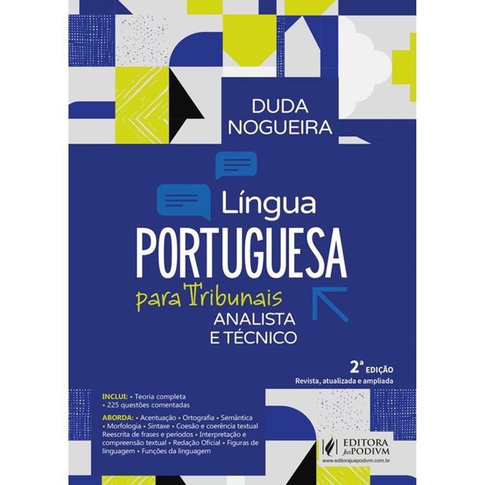 Este livro foi elaborado com base nas provas aplicadas pelos Tribunais – TSE, TST, TREs, TRFs, TRTs e TJs. Possui teoria e questões comentadas de gramática – incluindo coesão, coerência e reescrita de frases –, interpretação e compreensão textual, Redação Oficial e figuras de linguagem.