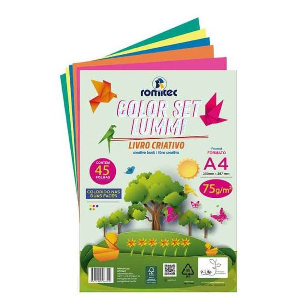 Descrição complementar - O Livro Criativo Color Set Lummi ROMITEC, é um livro pedagógico com atividades como colagem, dobradura e recorte, pode ser usado em atividades escolares e como entretenimento. Além do livro, o produto acompanha 45 folhas de cores fluorescentes, produto 100% reciclável.