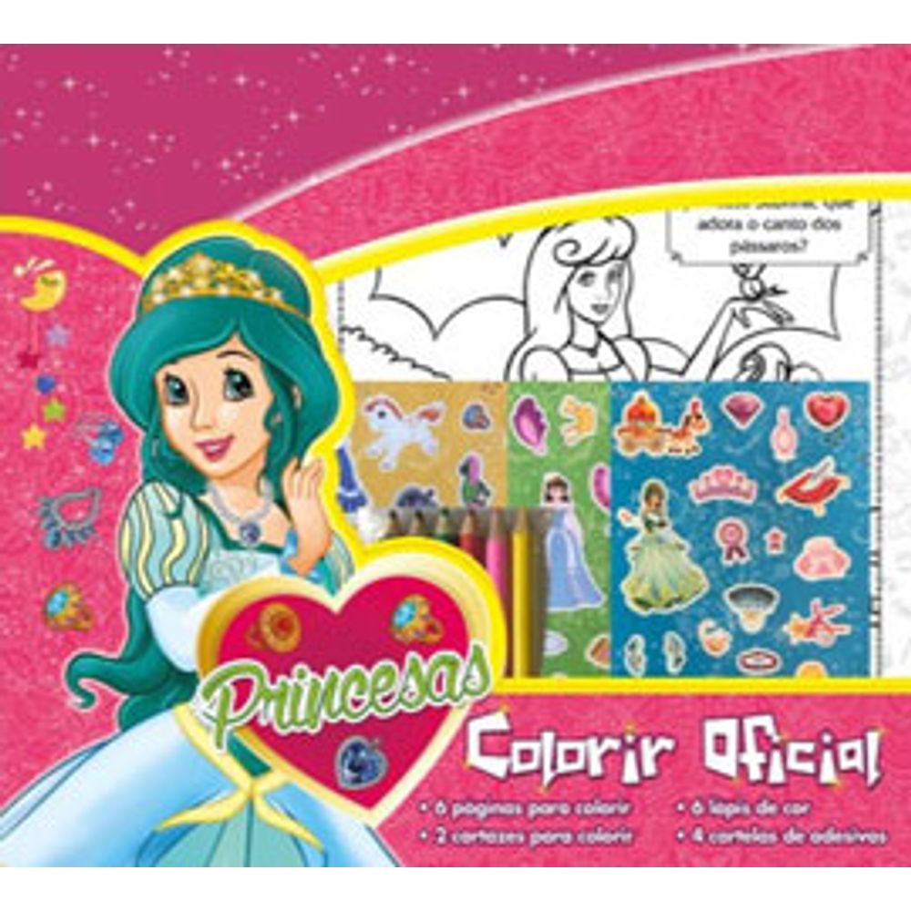 Princesas para Colorir Oficial são 6 páginas para colorir, 2 cartazes para colorir, 4 cartelas de adesivos e 6 lápis para colorir. Os desenhos trazem todo encanto das princesas e todas as coisas que elas adoram fazer, com todo charme e a publicação promete agradar as crianças do começo ao fim. Para quem gosta das princesas e quer se tornar uma princesa igual, nada melhor do que começar se divertindo com elas.