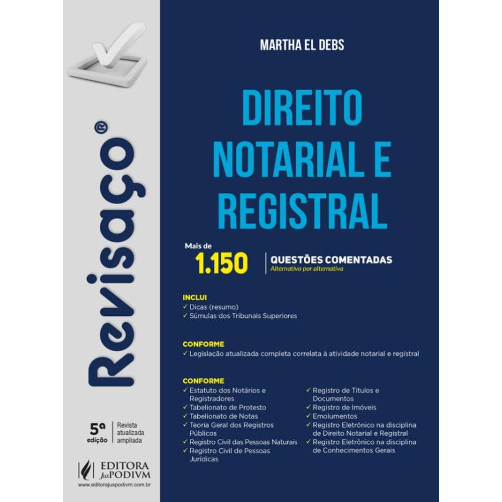 Mais de 1.150 questões comentadas alternativa por alternativa O LEITOR ENCONTRARÁ: - Questões comentadas alternativa por alternativa, por especialistas - Tabela de incidência dos temas em provas de concursos - Dicas (resumo) ao final dos capítulos - Súmulas dos Tribunais Superiores relacionadas CONFORME: - Legislação atualizada completa correlata à atividade notarial e registral ABORDA: - Estatuto dos Notários e Registradores - Tabelionato de Protesto - Tabelionato de Notas - Teoria Geral dos Registros Públicos - Registro Civil das Pessoas Naturais - Registro Civil de Pessoas Jurídicas - Registro de Títulos e Documentos - Registro de Imóveis - Emolumentos - Registro Eletrônico na disciplina de Direito Notarial e Registral - Registro Eletrônico na disciplina de Conhecimentos Gerais CONHEÇA A COLEÇÃO: REVISAÇO é a consagrada coleção de questões comentadas da Editora Juspodivm. Com cuidado, pensamos num formato que fosse além dos comentários das questões. Algo que realmente pudesse ajudar o aluno no estudo para o Exame de Ordem, principalmente na revisão final. Para isso, os livros da coleção são estruturados didaticamente da seguinte forma: - Questões divididas por matéria e assunto, comentadas assertiva por assertiva, item por item, demonstrando tanto o que está certo como o que está errado na questão; - Sempre que possível, há uma “nota do autor” em cada questão trazendo comentários que vão além do assunto abordado no exercício. Ao final das disciplinas apresentamos: - Dicas de estudo, funcionando como verdadeiro resumo da matéria; - Súmulas dos Tribunais Superiores; A ideia, portanto, é apresentar a prática do Exame da Ordem (questões), a doutrina para estudo (dicas) e a jurisprudência (súmulas), formando a tríade necessária para uma revisão (verdadeiro REVISAÇO!) rumo ao sucesso na aprovação. Vários livros compõem a coleção e, para todos, chamamos grandes nomes, professores experientes, profissionais de destaque e especialistas em cada área para que organizassem as obras e comentassem as questões. Acreditamos que essa coleção será bastante útil aos candidatos para o Exame de Ordem. EDITORA JUSPODIVM