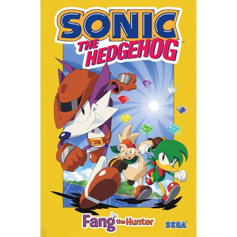 Fang the Hunter is always on the lookout for treasure, and rumors of an eighth Chaos Emerald are too juicy to ignore. If anyone can find the too-good-to-be-true gem, it’s this crafty bounty hunter and his team: Bark the Polar Bear and Bean the Dynamite! And who better to get information about the Chaos Emeralds from than the likes of Knuckles the Echidna, Miles “Tails” Prower, and Sonic the Hedgehog himself! Meanwhile, Sonic and Tails have their own problems to deal with: a mysterious disappearing flying battle station! But what does the evil Dr. Eggman have to do with it? Find out as Fang and his gang embark on a treasure hunt for the ages where they’ll have to use every ounce of their criminal creativity to evade the do-gooders and claim their prize. Fingers crossed it actually exists! Eight Chaos Emeralds? Sounds too good to be true!