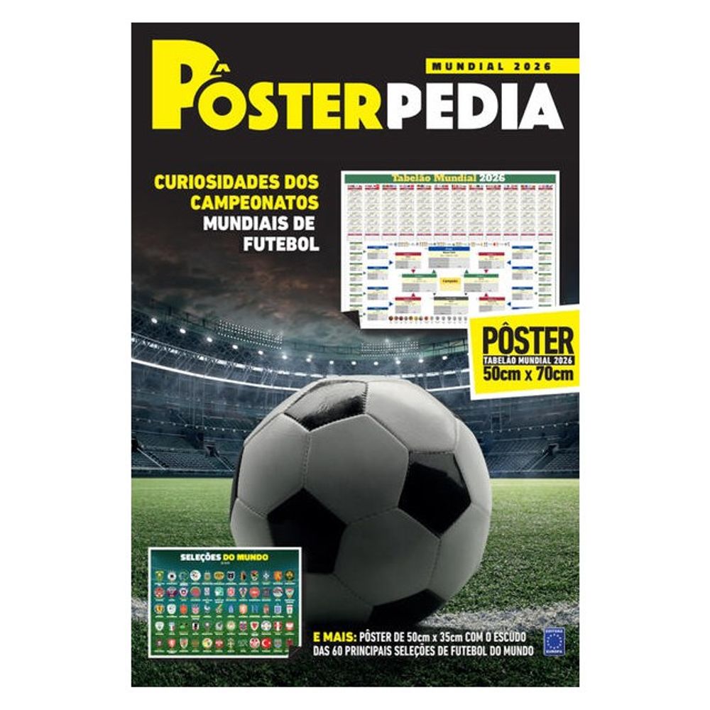Edição especial da Posterpedia com tudo que você precisa para acompanhar o jogos do campeonato mundial de futebol de 2026. De um lado curiosidades e do outro uma tabela gigante no formato 50x70cm para usar em casa, na escola, na empresa, no prédio, no restaurante e todos acompanharem, dia a dia, jogos da copa. Está tudo organizado com horários do Brasil, datas, locais, times... além de curiosidades com emblemas das seleções, as bolas de campeonatos passados, os campeões e principalmente o chaveamento organizado. Para acompanhar e guardar de recordação deste campeonato que será o maior da história com 104 partidas diferentes.