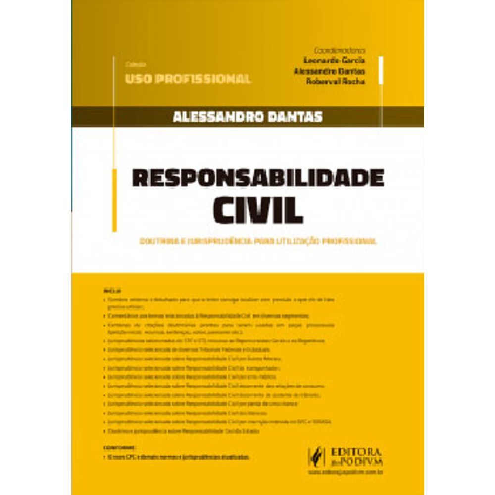 Doutrina e jurisprudência para utilização profissional O LEITOR ENCONTRARÁ: - Sumário extenso e detalhado para que o leitor consiga localizar com precisão o que ele de fato precisa utilizar; - Comentários aos temas relacionados à Responsabilidade Civil em diversos segmentos; - Centenas de citações doutrinárias prontas para serem usadas em peças processuais (petição inicial, recursos, sentenças, votos, pareceres etc.); - Jurisprudências selecionadas do STF e STJ, inclusive as Repercurssões Gerais e os Repetitivos; - Jurisprudência selecionada de diversos Tribunais Federais e Estaduais; - Jurisprudência selecionada sobre Responsabilidade Civil por Danos Morais; - Jurisprudência selecionada sobre Responsabilidade Civil do transportador; - Jurisprudência selecionada sobre Responsabilidade Civil por erro médico; - Jurisprudência selecionada sobre Responsabilidade Civil decorrente das relações de consumo; - Jurisprudência selecionada sobre Responsabilidade Civil decorrente de acidente de trânsito; - Jurisprudência selecionada sobre Responsabilidade Civil por perda de uma chance; - Jurisprudência selecionada sobre Responsabilidade Civil dos Bancos; - Jurisprudência selecionada sobre Responsabilidade Civil por inscrição indevida no SPC e SERASA; - Doutrina e jurisprudência sobre Responsabilidade Civil do Estado. CONFORME: - Novo CPC e demais normas e jurisprudências atualizadas. POR QUE ESCOLHER O LIVRO RESPONSABILIDADE CIVIL? A presente obra que vem à tona é algo completamente distinto de tudo que você, leitor profissional, já viu em sua vida sobre a temática de “Responsabilidade Civil”. É uma obra profissional que entra nos detalhes dos detalhes sobre o tema em diversos seguimentos que o assunto é tratado na doutrina e em nossos Tribunais. Analisamos muito da doutrina pátria, estudamos minuciosamente os entendimentos dos Tribunais Pátrios, especialmente os Superiores, e organizamos um material absolutamente completo e atualizado para quem efetivamente quer, em nível profissional, trabalhar nesta área, sendo obra cogente para Advogados, Promotores, Procuradores, Desembargadores, Ministros e até mesmos concurseiros que queiram entender melhor seus direitos. Fizemos questão de fazer um sumário detalhado e minucioso para que o leitor, já analisando o mesmo, vá exatamente ao ponto e posicionamento que pretende adotar. Foi um trabalho árduo, mas tenho certeza que facilitará muito a vida dos leitores. Posso dizer que é uma obra bem completa, que não obstante o isolamento familiar e a solidão quando de sua confecção, fiz sabendo que era algo precioso que valeria a pena. Espero que gostem e estamos, como sempre, abertos às críticas.