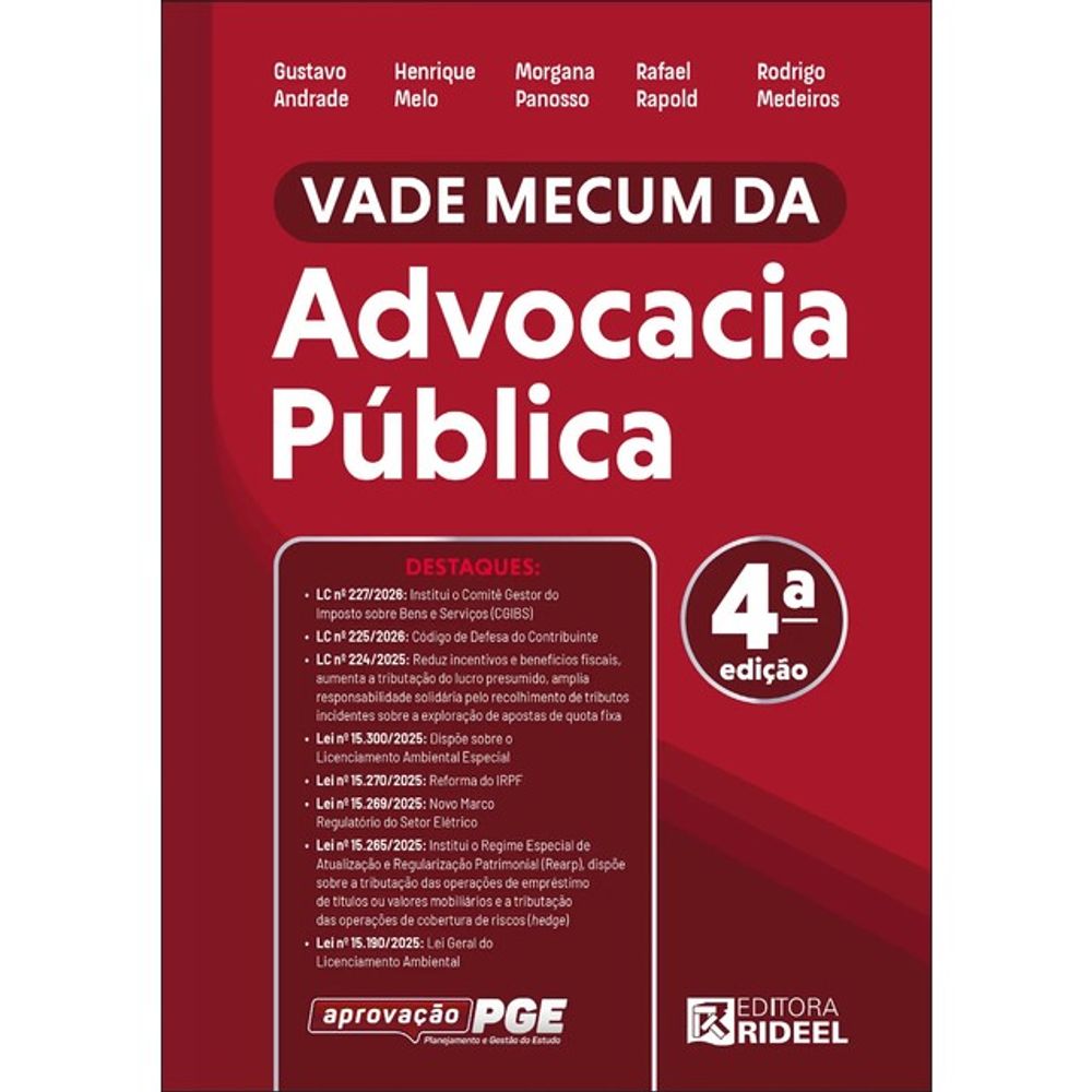 A Editora Rideel, reconhecida no mercado editorial pela excelência de seus Vade-Mécuns, em parceria com o curso APROVAÇÃO PGE, apresenta a 4ª edição do Vade Mecum Advocacia Pública, desenvolvido para atender, com precisão e confiabilidade, às necessidades de estudantes, pesquisadores e profissionais que atuam ou pretendem atuar nas carreiras jurídicas da Administração Pública.
