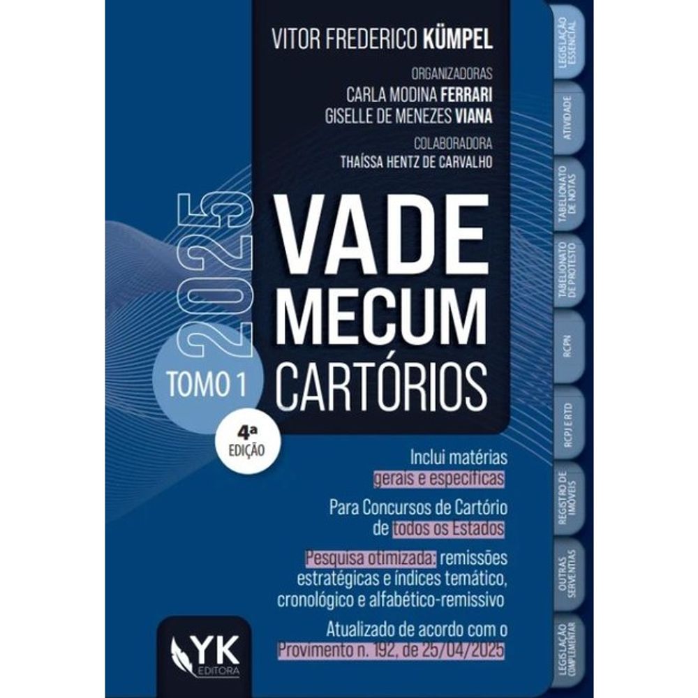 O Vade Mecum Cartórios 2025 é dividido em dois tomos (tomo I e tomo II).