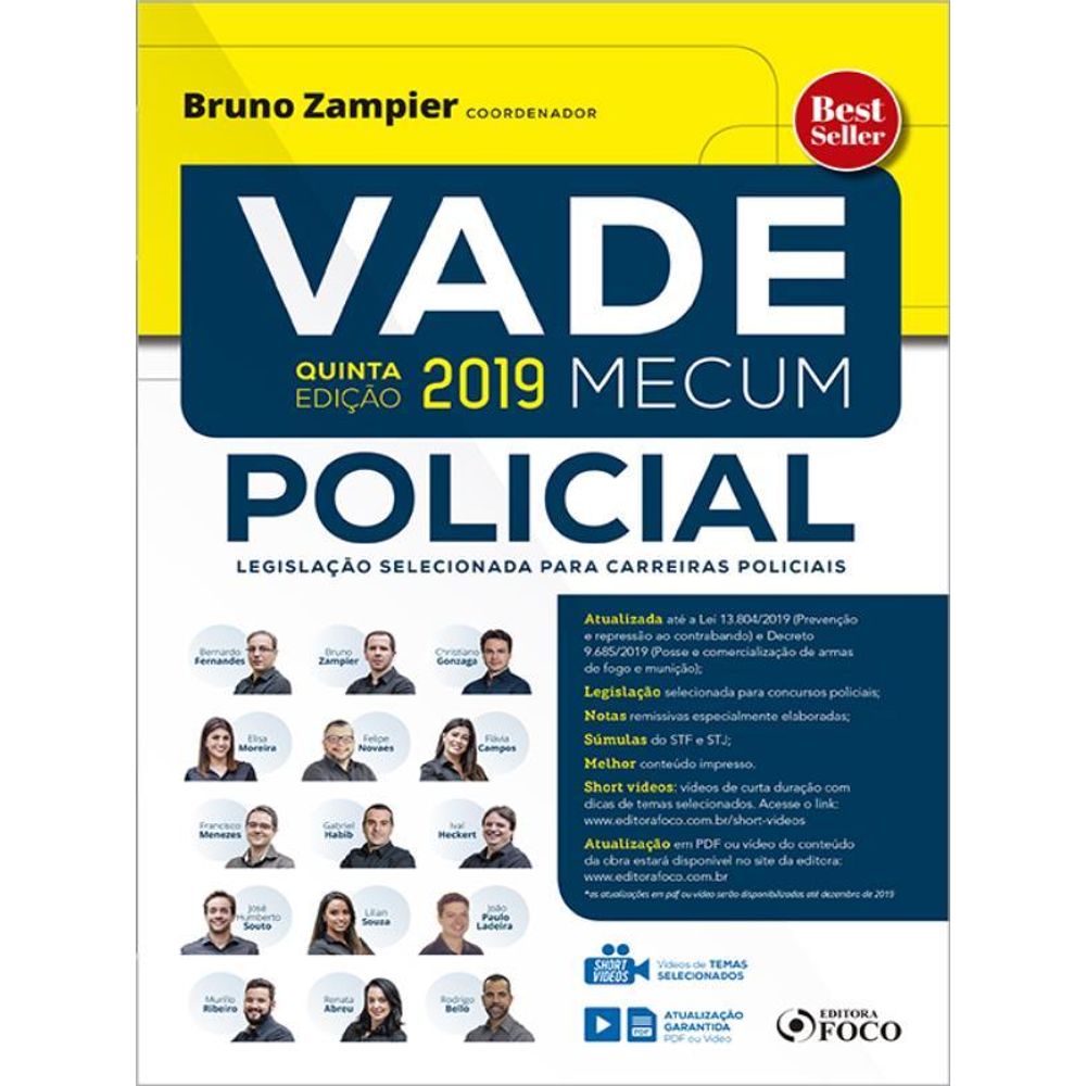 Seja muito bem-vindo à 5ª Edição do VADE MECUM POLICIAL! Após o sucesso das quatro primeiras edições, que se esgotaram, apresentamos esta, ainda mais completa e focada nos concursos policiais. Como professor de cursos preparatórios para concursos públicos desde o ano de 2002, percebemos claramente a cobrança cada vez mais específica e relacionada ao cargo pretendido. É a chamada pertinência temática. Neste sentido, inicia-se a busca pela melhor preparação possível, devendo o candidato frequentar cursos, ler doutrina e jurisprudência direcionadas e, claro, ter acesso à vasta legislação exigida pelos editai É o que naturalmente ocorre também no âmbito das carreiras policiais, a exemplo de Delegado de Polícia, Agente, Investigador, Escrivão, Papiloscopista, Perito Criminal, Policial Rodoviário Federal, Oficial ou Soldado das Polícias Militares. A preparação para tais concursos envolve o acesso a legislação específica, confecção de peças de polícia judiciária, testes de aptidão física, exames médicos rigorosos, investigação social, aprovação em cursos de formação promovidos por academias de polícia entre outros desafios. Com o objetivo de atender aos seus anseios em busca do objetivo final, as principais leis exigidas nos concursos policiais foram reunidas e sistematizadas por uma experiente equipe de professores. Elaboramos uma criteriosa remissão de artigos e súmulas a fim de facilitar os estudos de nosso futuro colega policial: você! Foi desta forma que criamos o produto que agora tem em suas mãos e que certamente colaborará não apenas em sua jornada como candidato, mas também no exercício da nobre profissão de policial. Por fim, ressaltamos duas grandes novidades aos nossos leitores: 1) os SHORT VIDEOS, que são vídeos de curta duração com dicas de TEMAS SELECIONADOS e 2) ATUALIZAÇÃO em PDF e VÍDEO do conteúdo da obra até dezembro de 2019.